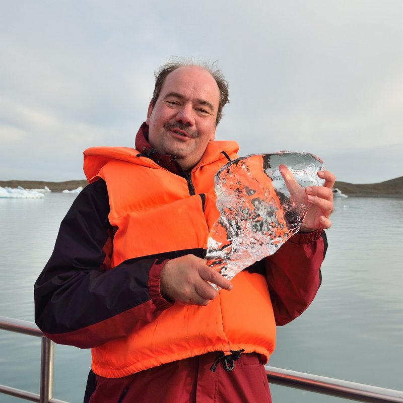 Ich mit dem Eisklumpen. Die Eisländer machen übrigens auch Bier aus diesem Gletscherwasser. | ![]() |