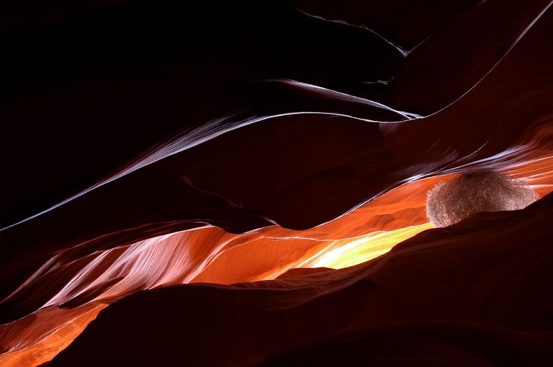 Ich bin der Beste. Das wurde mir schlagartig klar, als ich gemerkt habe, dass ich soeben ohne Staiv den Antelope Canyon betreten hatte. Wie konnte ich nur!?! Martins Tipp war, die Kamera in die Mütze auf den Boden zu legen und mit Selbstauslöser zu fotografieren. Hierbei kam das heraus. Der rollende Busch ist von oben in die Spalte gefallen. Wenn er nicht gestorben ist, dann klemmt er heute noch da.