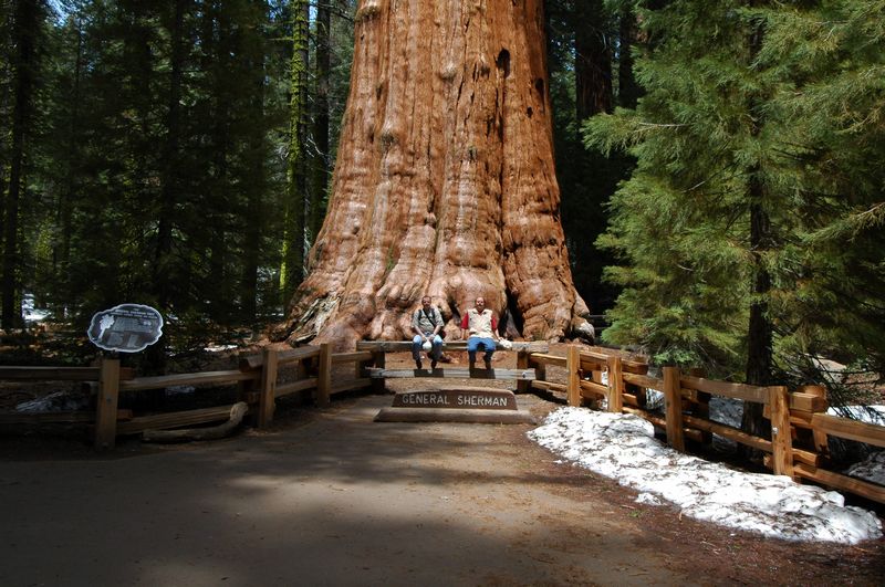 Wenn man den Stamm dieser Mammutbäume berührt, dann fühlt es sich ganz leicht, in etwa wie Balsaholz, an. Hier liegt noch Schnee, weil wir sehr hoch über dem Meeresspiegel sind.